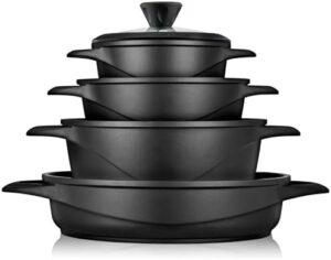 briebe Batería Cocina Inducción 8 Piezas, Juego 4 Ollas Aluminio Fundido, Antiadherente ILAG GRANITEC sin PFOA, Set Cazuelas Tapas Cristal, Guantes Silicona, Vitrocerámica, Gas, Horno, MGK-17S