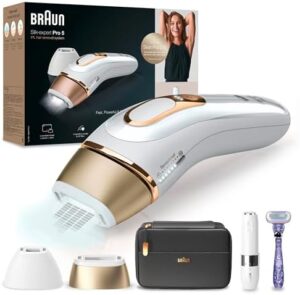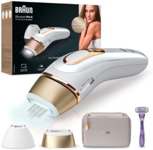 Braun Silk-expert Pro 5 Depiladora Mujer Luz Pulsada IPL, con 2 Cabezales Standar y 2 de Precisión, Alternativa a la Depilación Láser en Casa, Regalos Originales para Mujer, PL 5137MN, Blanco/Dorado