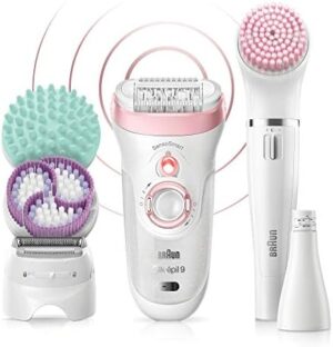 Braun Silk-épil 9 Kit Depiladora Eléctrica Mujer, 9-995 Deluxe 9 en 1, Depilación inalámbrica en seco y húmedo, Depiladora, afeitadora, exfoliante, kit de limpieza facial y corporal, blanco/rosa