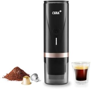 CERA+ Máquina de Espresso Eléctrica Portátil Auto-calentamiento en 3-4 Minutos, Cafetera Mini de 20 Bares con Batería Recargable. Compatible con Cápsulas NS y Café Molido para Viajes y Camping