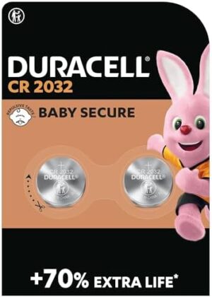 Duracell – Pilas de botón de litio 2032 de 3 V, paquete de 2, Tecnología Baby Secure, uso en llaves con sensor magnético, básculas, elementos vestibles, dispositivos médicos, Cromo (DL2032/CR2032)