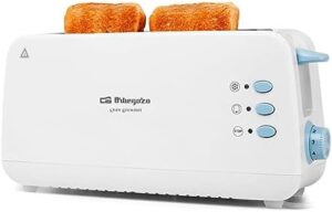 Orbegozo TO 4012 – Tostadora de ranura larga, calienta panecillos, 7 niveles de tostado, función descongelación y recalentamiento, bandeja recogemigas, 850 W, Color Blanco
