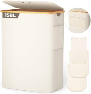 OUSFOT Cesto para la Ropa Sucia con 3 Compartimentos para Ropa Sucia Mango de Bambú 158L con Tapa Bolsillo Trasero de Malla Plegable Cesto para la Colada Beige