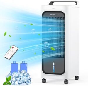 SENTICUM Aire Acondicionado Portatil 3 en 1, Enfriador de Aire Evaporativo, Ventilador, Humidificador, Tanque de 5,5L, con 3 Velocidades, Temporizador, Control Remoto, Silencioso, Portátil