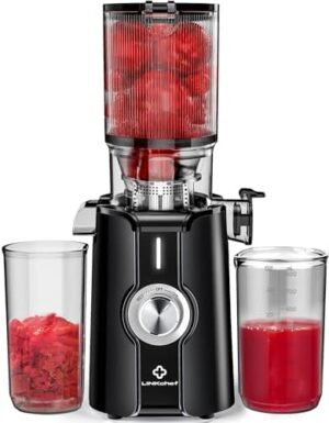 Sin Preparación Extractor de Jugo, Limpieza Rápida 115mm Juicer, LINKChef Extractor de Zumos y Verduras Enteras de Prensado en Frio, Fácil de Instalar, 1.2L, 200w, Ferroso