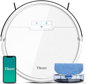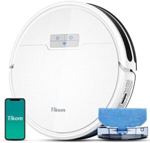 Tikom Robot Aspirador y Fregasuelos, G8000 Pro Robot Aspirador, Succión Fuerte de 4500 Pa, Carga Automática, WiFi, 150 Minutos MAX, Ideal para Pelo de Mascota, Alfombras y Suelos Duros, Blanco