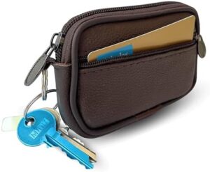 Monedero Hombre Pequeño Piel | Porta Monedas con Doble Cremallera de Seguridad | Monedero Viaje con Arandela para Llaves con Cinta de Cuero para Llevarlo en el Cinturón (Marrón)
