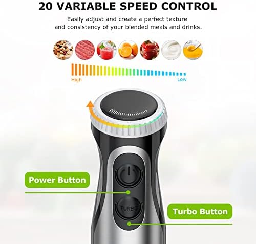 【20 velocidades efectivas y función turbo】La batidora de mano Bonsenkitchen Immersion con configuraciones ajustables de 20 velocidades puede mezclar rápidamente los ingredientes y cumplir con diversas tareas de licuado. Un botón Turbo separado brinda una rápida ráfaga de potencia para hacer explotar el hielo más rápido y mezclar el ingrediente o refrescar el hoja con agua para una limpieza rápida.