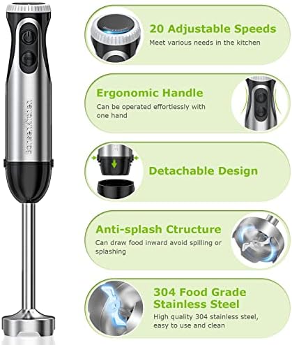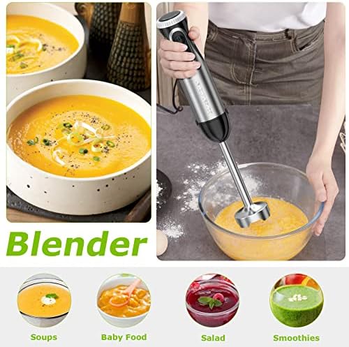 Bonsenkitchen Batidora de Mano, 2-in-1 Multifunción Batidota con Batidor, 20 Velocidades Ajustables, Varilla Mezcladora para Alimentos para Bebés, Sopa, Batidos, Puré, Salsa