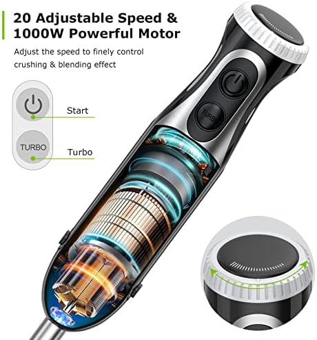 【Velocidad ajustable de 20 velocidades + botón Turbo】 Batidora de mano profesional de velocidad variable de 20 velocidades, puede ajustar fácilmente la velocidad y la potencia de acuerdo con los diferentes alimentos. El botón TURBO alcanza instantáneamente la potencia máxima para obtener los mejores resultados.