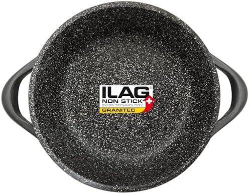 ANTIADHERENTE ILAG GRANITEC: Set de cazuelas fabricadas con antiadherente GRANITEC CERAMIC de ILAG, marca Suiza especialista en recubrimientos antiadherentes de alta calidad. Su proceso de fabricación controlado y seguro da como resultado un antiadherente de 4 capas con refuerzo cerámico que ofrece una excelente resistencia a rayaduras y abrasiones. Ideal para uso diario e intensivo, además el efecto de granito aporta un diseño especial.
