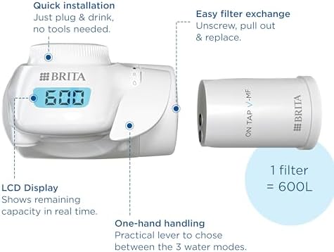 Incluye: 1x sistema de filtración de agua del grifo BRITA ON TAP Pro V-MF, 1x cartucho filtrante ON TAP V-MF (600L), 5x adaptadores diferentes para la instalación
