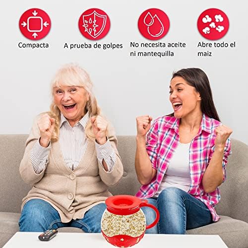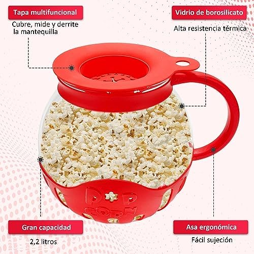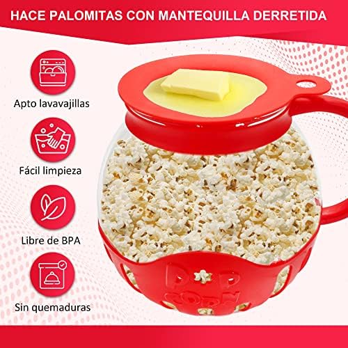 PRÁCTICO. Innovador bol palomitero de vidrio, para hacer palomitas de maíz crujientes en su microondas sin mantequilla ni aceite añadido. Puede hacerlas solas o si lo prefiere, con sabor a mantequilla, gracias a su tapa de silicona de grado alimenticio que calcula la cantidad de maíz a echar y regula la adición de mantequilla para que se derrita mientras se cocinan en el microondas. El diseño con asa permite sacar fácilmente el bol palomitero del microondas sin peligro de quemaduras.