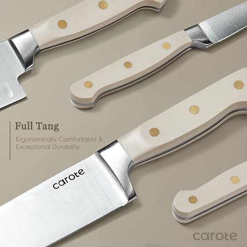 [MANGO RESISTENTE Y CÓMODO]- El mango del juego de cuchillos cocina de CAROTE está hecho de caucho termoplástico ergonómico y acero inoxidable. Los remaches de acero inoxidable aseguran la hoja de mango completo al mango, cómodo de sostener en la mano. El resistente mango de hoja de acero inoxidable es muy funcional y se siente muy bien en la mano