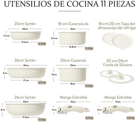 👨🍳[Set de 11 piezas]: 11piezas bateria de cocina que incluye 2x sartenes(20cm y 26 cm) ; 1x Wok(26cm), 2x Cacerolas 18/20cm (1,8L/2,6 L); 2xmango extraíbles; 2x tapas de vidrio con silicona redonda (20cm/26cm); 2x tapas herméticas (18cm y 20cm)