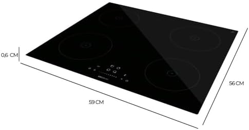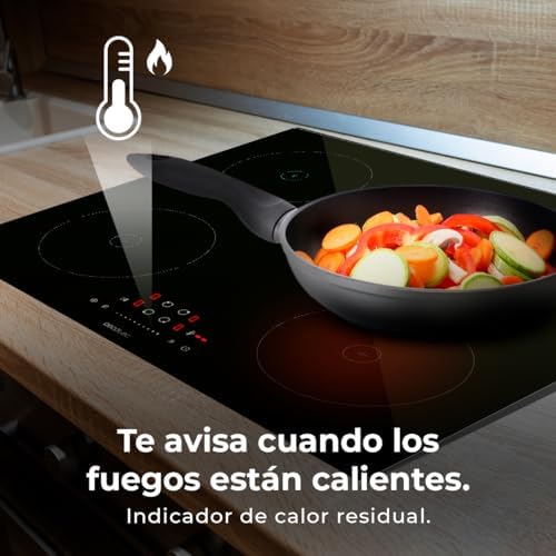 Indicador de calor residual, que avisa mediante una luz cuándo los fuegos están calientes. 4 zonas de fuego. 2 de 16 cm (1500W) y 2 de 18 cm (2100W).