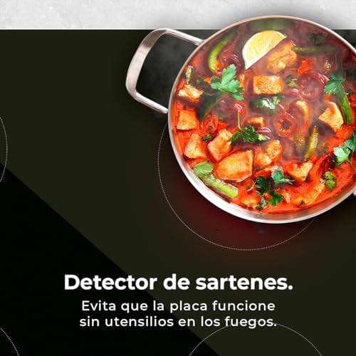 Sistema keep warm: mantén la temperatura de tus alimentos sin que ello dé lugar a que se cocinen demás. Contiene reconocimiento de utensilios mediante el cual se evita que la placa funcione sin tener ninguno de estos encima de los fuegos.