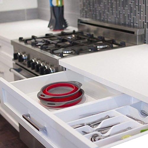 DISEÑO QUE AHORRA ESPACIO: Los coladores son plegables, por lo que no ocupan el espacio necesario en los armarios de su cocina. Apílelo en sus otros utensilios de cocina en su armario o colóquelo de pie a un lado y mantenga su espacio ordenado. Mantenga su cocina limpia y ordenada.