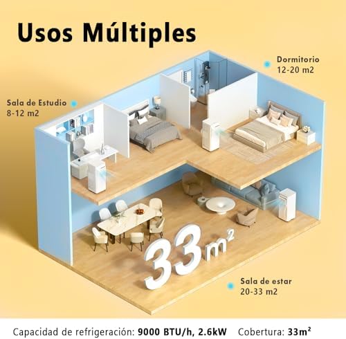 ★ POTENTE Y SILENCIOSO – Con una capacidad de refrigeración de 2300 frigorías (2,6 kW / 9000 BTU), este enfriador de aire es ideal para habitaciones medianas de hasta 88 m³ (aproximadamente 33 m²). A pesar de su potencia, es totalmente silencioso, emitiendo solo 47 dB. Así, podrás disfrutar de un ambiente fresco sin perturbaciones mientras duermes.