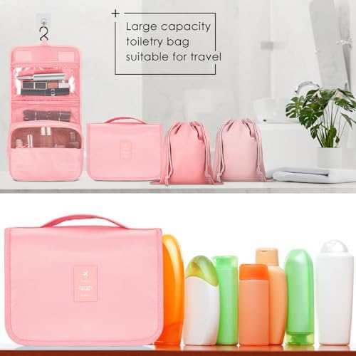 Combinación perfecta: Neceser Maquillaje Impermeable de Gran Capacidad con Gancho Colgante, duraderos y reutilizados. Incluyendo: Neceser de Viaje * 1, bolsa con cordón * 2, utilizado para almacenar diversas necesidades de viaje; botella de crema * 2 + botella de spray * 2 + embudo * 1 + cuchara de crema * 1, almacene más artículos de tocador pegajosos, como cremas como crema, polvo, almacenamiento de removedor de maquillaje.