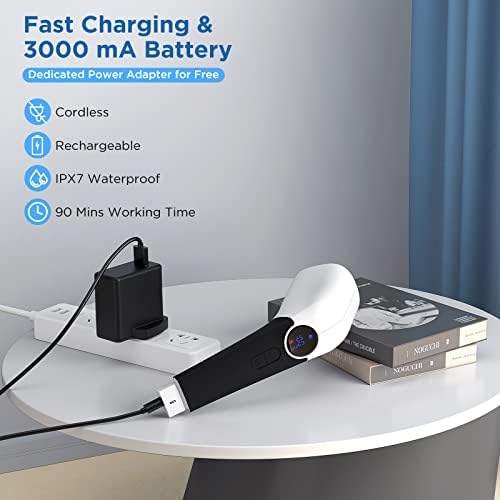 【Capacidad de la batería 3000mah & IPX7 impermeable】cepillo limpieza ducha puede seguir funcionando durante 90 minutos después de una sola carga. Solo se necesitan tres horas para estar completamente cargado. Grado de impermeabilidad mejorado a IPX7 para facilitar el uso y la limpieza bajo el agua. Nota: Evite exponer el altavoz al agua.