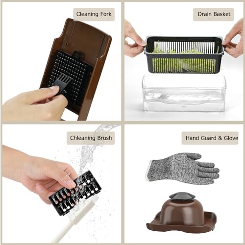 【Nuevo modelo mejorado】¡El nuevo cortador de verduras de cocina mejora la calidad y la apariencia! El diseño de la canasta de goteo le permite separar rápidamente las verduras de la humedad. Los nuevos guantes protectores y el cepillo de limpieza también garantizan la seguridad y la limpieza de los cortadores de verduras.