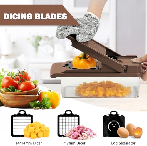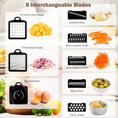 【17 multifuncional en 1 mandolina】El cortador de verduras contiene 7 cuchillas: 2 cuchillas para picar, 2 cuchillas para rebanar, 2 ralladores juliana, 1 cuchilla para triturar, 1 separador de huevos, 1 cesta de drenaje, 1 protector de mano y guante, 1 tenedor y cepillo de limpieza. 1 * contenedor de alimentos. ¡Es la mandolina de cocina perfecta para todos!
