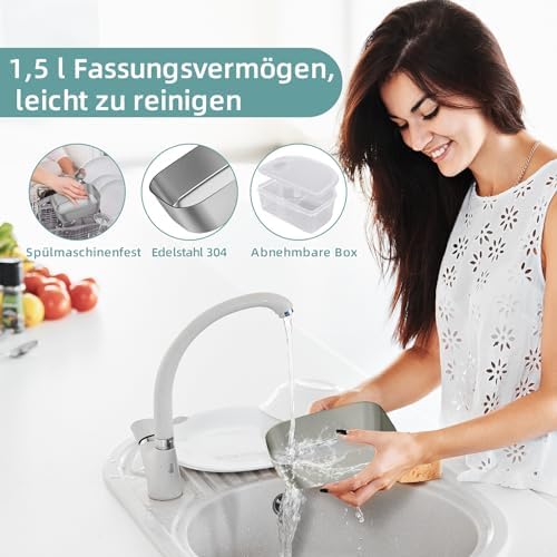 El recipiente de acero inoxidable 304 tiene una capacidad de 1,5 litros y es totalmente extraíble para facilitar la limpieza. No produce ningún olor y no es propenso a la proliferación de bacterias, garantizando la absoluta higiene y seguridad de tus alimentos. También es apto para lavavajillas. Sin embargo, tenga en cuenta que la base calefactora nunca debe sumergirse en agua.