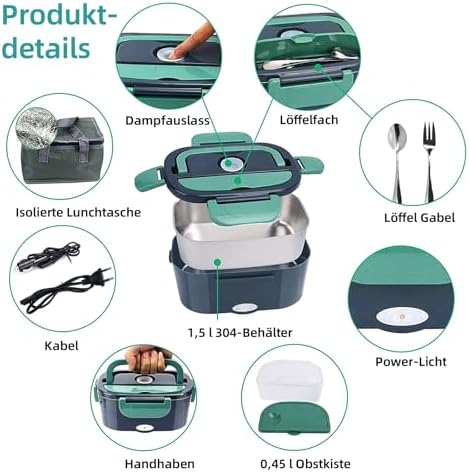 Contenido de entrega: 1 fiambrera eléctrica. 1 cable de alimentación para vehículo (12 V/24 V). 1 cable de alimentación con enchufe para Reino Unido (220-240 V) 1 x cuchara y 1 x tenedor 1 manual de usuario. 1 bolsa para el almuerzo. 1 recipiente de acero inoxidable de 1,5 l. 1 compartimento de plástico de 0,45 L