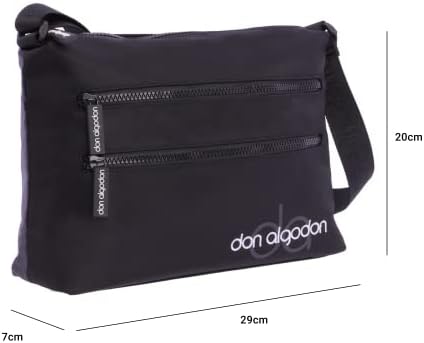 Bolso bandolera de mujer DON ALGODON Zita de nylon negro. El bolso esta fabricado en nylon muy resistente, tiene un amplio compartimento central, con interior de poliester en el que encontraras un bolsillo con cremallera trasero y bolsillo delantero abierto. Tambien lleva dos bolsillos exteriores frontales con cremallera y otro detras que junto con el logo bordado y estampado le dan un toque muy original. El asa es ajustable de cinta de nylon decorada con el logo de Don Algodon.(30×9,5x19cm)