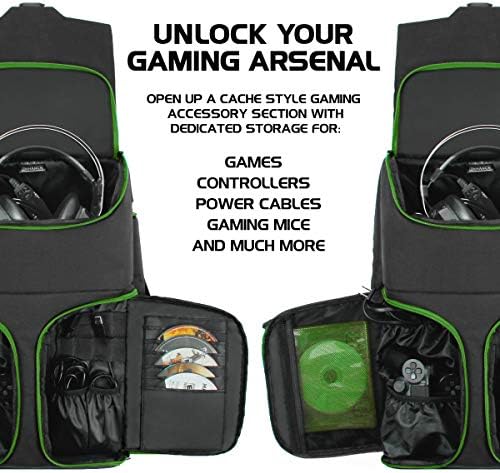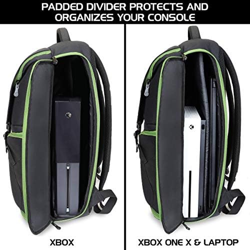 El gran compartimento de la consola se adapta a Xbox Series X / S, Xbox One X y portátiles para juegos (hasta 43,2 cm), incluidos Razer Blade, HP Omen, Acer Predator Helios y más. Incluye divisor acolchado para almacenar de forma segura teclados y computadoras portátiles en el mismo compartimento.
