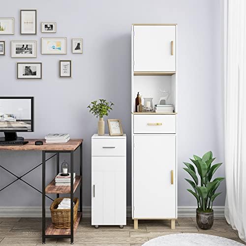 Material: MDF E1Color: Blanco + Madera claraCapacidad de carga: aprox. 5 kg/capaRango de altura del estante ajustable: 6,4 cmDimensiones: 39x30x180 cm (Ancho x Fondo x Alto)Tamaño del cajón: 36x25x9cm cm (Ancho x Fondo x Alto)Tamaño del compartimento abierto:39x30x34 cm (Ancho x Fondo x Alto)