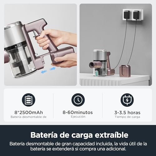 60 minutos de autonomía y batería – Esta vertical sin cable ofrece una batería de optima calidad con 60 minutos de autonomía, lo que le permite limpiar con eficacia y facilidad toda su casa de una vez- La batería extraíble facilita su carga por separado o la compra de una de repuesto