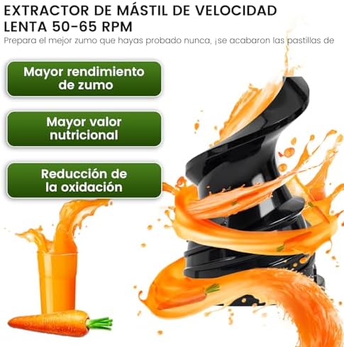Alto Rendimiento de Jugo: Con un potente y fuerte barrena, el Extractor masticador para vegetales y frutas gira a una velocidad baja de 50 a 65 RPM para minimizar la acumulación de calor, la oxidación y preservar la nutrición. El alto rendimiento del Extractor alcanza hasta el 90%, evita el desperdicio de jugo.