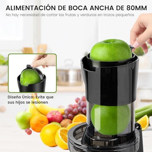 Tolva de Alimentación Grande: diseñada con una tolva de alimentación de 80 mm de ancho, que puede aceptar piezas grandes de frutas y verduras. No es necesario cortar las frutas y verduras grandes en trozos pequeños. ¡Más rápido y más fácil de exprimir! Reduce en gran medida el tiempo de preparación y limpieza. Cortar menos los ingredientes también ayuda a reducir la oxidación. Con motor potente de 200 W, que puede funcionar de manera eficiente y proporcionar un entorno de trabajo tranquilo.