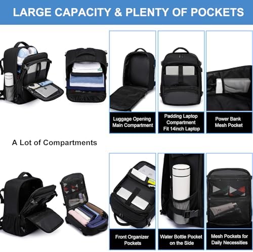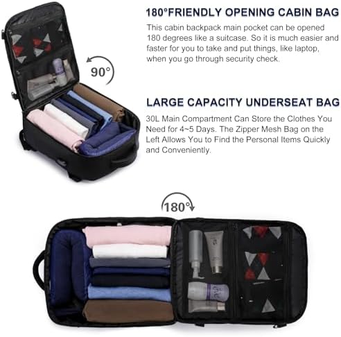✈️MUCHO ESPACIO Y MUCHOS COMPARTIMIENTOS: el equipaje de mano de cabina de 32 litros parece pequeño, pero sorprendentemente tiene capacidad para más de lo que piensas. Amplio compartimento principal con apertura estilo maleta, puede satisfacer las necesidades de viajes cortos de 4 a 5 días. 1 bolsillo acolchado separado para computadora portátil o tableta de 15,6 pulgadas; Bolsillos laterales para guardar botellas de agua, bolsillo de seguridad en la parte trasera para cartera y pasaporte.