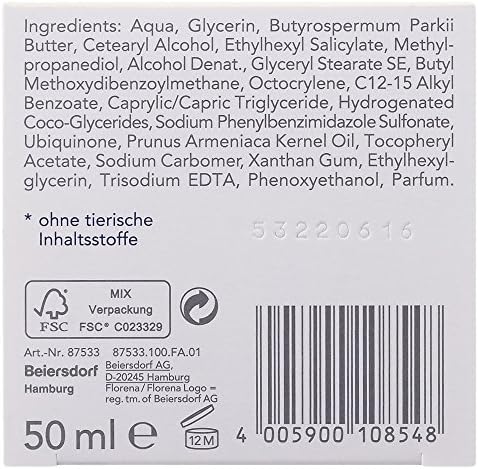 Descripción: cuidado hidratante suavizante para todos los tipos de piel. La coenzima Q10 es una parte importante del metabolismo energético de las células. Apoya las funciones biológicas de la piel, la protege de los radicales libres y previene la formación de arrugas prematuros. A medida que aumenta la edad, la producción propia del cuerpo disminuye de Q10. Las cremas con Q10 pueden contrarrestar este defecto. Compatibilidad con la piel dermatológicamente probada.