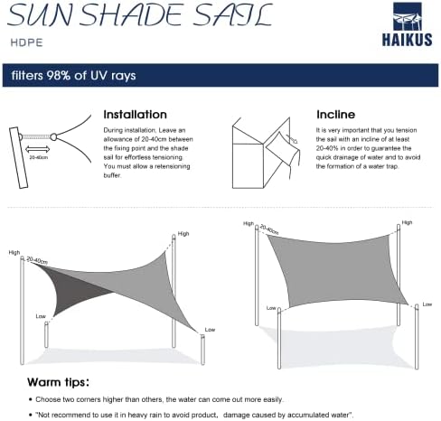 【Fácil de Instalar】: Viene con cuerdas para la instalación. Al instalar, reserve una distancia de 30-45 cm entre el punto de fijación y el anillo. No cuelgue la vela de parasol plana, asegúrese de que esté inclinada en un ángulo de 20-40 grados con respecto al plano horizontal, para que el agua de lluvia fluya rápidamente. Además, la lona sombra debe volver a tensarse periódicamente para mantener su superficie tensa y evitar la acumulación de agua.