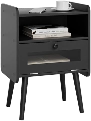 Mesa auxiliar pequeña: con cajones de almacenamiento y estante de madera abierto. Esta mesita de noche es pequeña pero suficiente para tener a mano el control remoto, vasos, medicamentos y otros elementos esenciales. La parte superior ancha es perfecta para exhibir una lámpara, un reloj, una maceta o un marco de fotos para ofrecer calidez y una decoración personalizada.