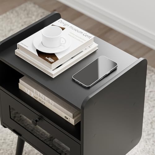 Mesita de noche moderna: mesa auxiliar negra clásica con puerta decorativa de vidrio frontal, líneas elegantes, esta mesita de noche emite un ambiente moderno en su dormitorio. También puede llamar la atención como mesa auxiliar o mesa auxiliar en toda la casa, agregando elegancia a la vida hogareña.