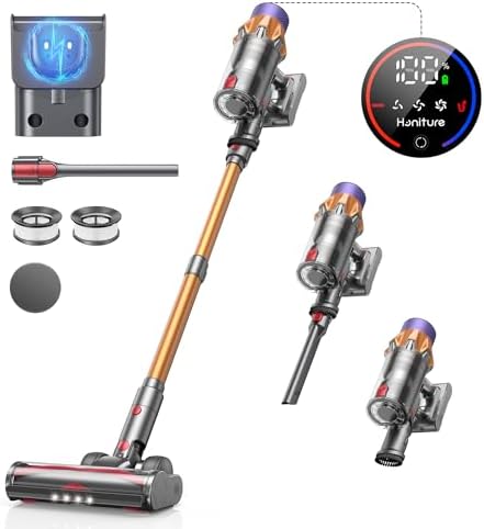【¡El último modelo! Aspiradora sin cable 45000PA/550W】 La última aspiradora inalámbrica de Honiture en 2024. Esta aspirador escoba potente está equipada con un potente motor sin precedentes de 550 W con una potencia de succión de hasta 45.000 PA. Recoge fácilmente cada partícula de polvo del suelo y la alfombra.
