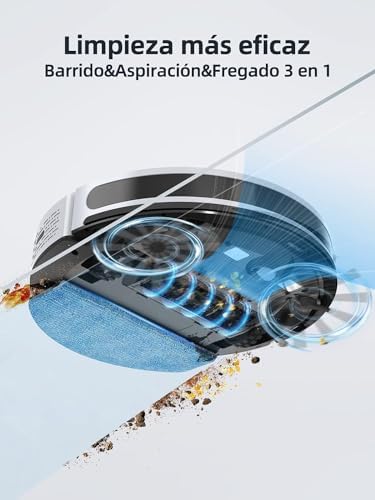 🔋【Diseño único 3 en 1】El diseño único incorporado de la caja de polvo hace que sea fácil de instalar y quitar en cualquier momento. El depósito de agua se puede colocar en el robot aspirador al mismo tiempo que el depósito de polvo de 450 ml, sin necesidad de sustituirlo. Modos de limpieza seleccionables: barrido/mopa/barrido-aspirado-mopa.