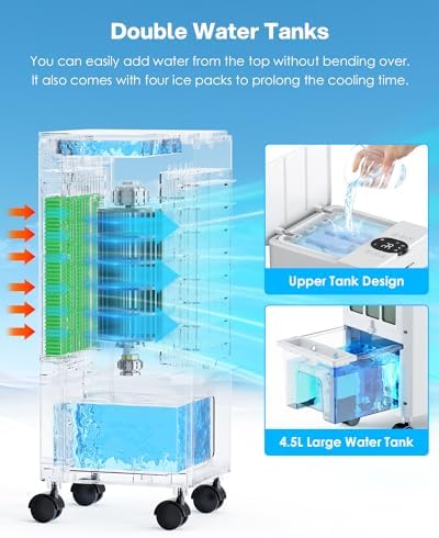 ❄️【Fácil de Usar & Capacidad de 4,5 L】Este aire acondicionado portatil tiene ruedas de 4×360°, por lo que puede colocar fácilmente el aire acondicionado donde lo necesite. La apariencia compacta y el peso liviano de este enfriador de aire portatil. El diseño de tanque de agua doble de 4,5 L de este aire acondicionado portatil sin tubo garantiza comodidad con su función de carga superior. Aporta una gran comodidad a la vida cotidiana.
