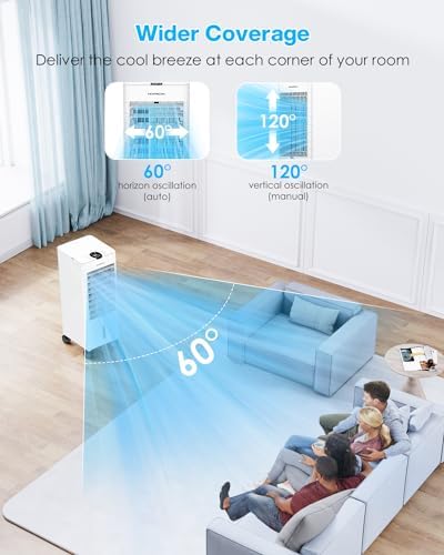 ❄️【Potente Motor & Amplio Giro】 El enfriador de aire cuenta con una rueda de ventilador tipo tambor mejorada y una persiana de amplio giro con giro automático hacia la izquierda/derecha dentro de un rango de 60°y ajuste manual hacia arriba/abajo dentro de un rango de 120°. Esto permite que el aire fresco circule por toda la habitación, cubriendo un área de hasta 30㎡, ¡asegurando que su habitación se llene de una brisa refrescante!