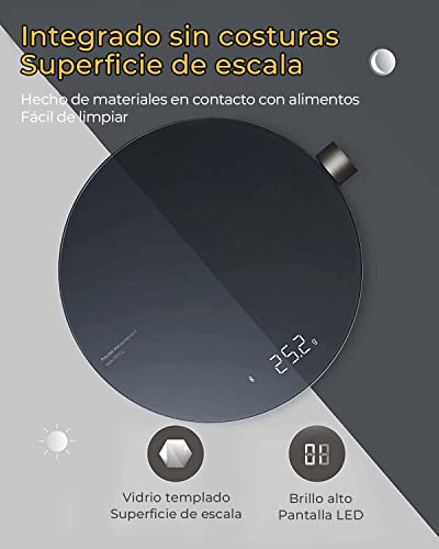 DISEÑO INTEGRADO: Los datos de pesaje se muestran claramente en la pantalla LED de alta resolución, que se encuentra debajo del vidrio templado transparente de la superficie de la báscula. Y la superficie integrada sin costuras de la escala de gramos está hecha de materiales en contacto con alimentos que son fáciles de limpiar.