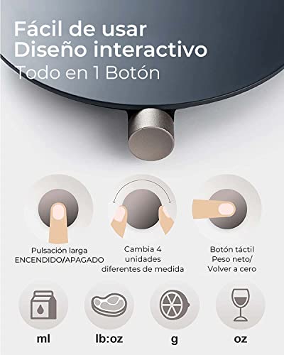 DISEÑO DE BOTONES TODO EN UNO: La báscula de cocina desarrolla un nuevo diseño interactivo para combinar diferentes funciones en un solo botón que es fácil de usar. Los usuarios pueden cambiar entre 4 unidades de peso: g/ml/oz/lb:oz sin cálculo manual para satisfacer diferentes necesidades de pesaje.