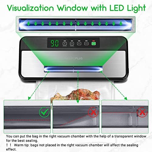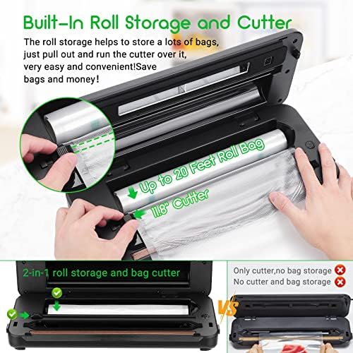 ✔️【Cortador incorporado y cámara para bolsas de vacío:】-Está equipada con un cortador de bolsas incorporado de 11.8/30cm y una cámara para almacenar bolsas de vacío, por lo que podemos colocar sin esfuerzo bolsas de alimentos del tamaño que deseemos. Ya no tendrá que preocuparse de que el tamaño de la bolsa no encaje en la máquina. Y adopta la cáscara del ABS y la placa de acero inoxidable, haciéndola durable y fácil limpiar.