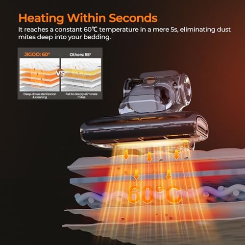 【Quiet design, no noise】Con un nivel de ruido de sólo 72dB, el aspirador de ácaros JIGOO es muy silencioso y no causa ningún ruido molesto durante su uso. Esto le permite utilizar el aparato por la noche o en ambientes tranquilos sin molestar a los demás.
