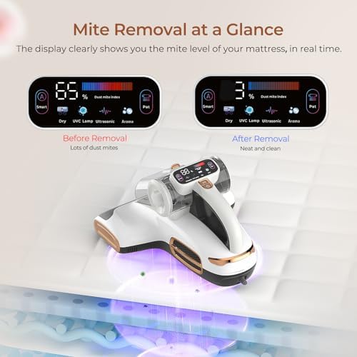 【Potente rendimiento y potencia de succión】Con una potencia de 700W, la aspiradora antiácaros puede eliminar hasta el 99,9% de los ácaros del polvo. La combinación de luz UV y vibración mata eficazmente a los ácaros, que luego pueden ser aspirados con la aspiradora.Inhibición duradera de la formación de nuevas bacterias y ácaros en la superficie de descanso.