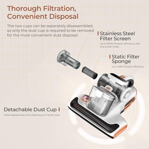 【Nueva actualización de doble taza individual】JIGOO T600 aspiradora de ácaros del polvo para colchones es una potente aspiradora especialmente diseñada para la eliminación de ácaros del polvo. Los dos contenedores de polvo están diseñados independientemente para una filtración de ácaros de polvo más limpia y un desmontaje más fácil.